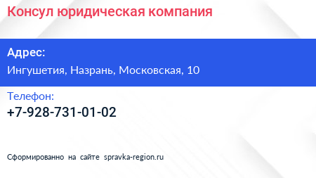 Консул, юридическая компания по адресу Ингушетия, Назрань, Московская, 10 в дальнейшем Организация, размещена в следующих категориях: