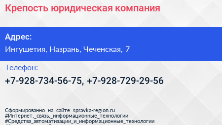 Крепость, юридическая компания по адресу Ингушетия, Назрань, Чеченская, 7 в дальнейшем Организация, размещена в следующих категориях: