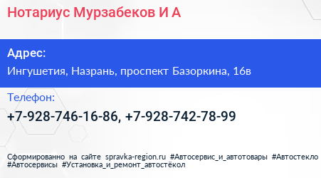 Нотариус Мурзабеков И.А. по адресу Ингушетия, Назрань, проспект Базоркина, 16в в дальнейшем Организация, размещена в следующих категориях:
