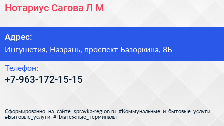 Нотариус Сагова Л.М. по адресу Ингушетия, Назрань, проспект Базоркина, 8Б в дальнейшем Организация, размещена в следующих категориях: