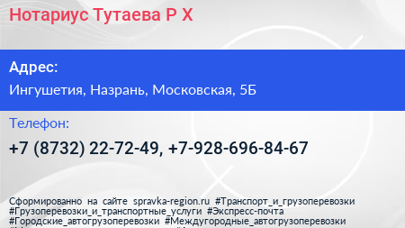Нотариус Тутаева Р.Х. по адресу Ингушетия, Назрань, Московская, 5Б в дальнейшем Организация, размещена в следующих категориях: