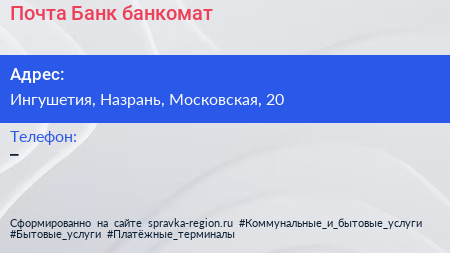 Почта Банк, банкомат по адресу Ингушетия, Назрань, Московская, 20 в дальнейшем Организация, размещена в следующих категориях: