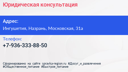 Юридическая консультация по адресу Ингушетия, Назрань, Московская, 31а в дальнейшем Организация, размещена в следующих категориях: