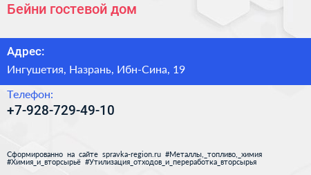 Бейни, гостевой дом по адресу Ингушетия, Назрань, Ибн-Сина, 19 в дальнейшем Организация, размещена в следующих категориях:
