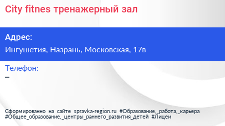 City fitnes, тренажерный зал по адресу Ингушетия, Назрань, Московская, 17в в дальнейшем Организация, размещена в следующих категориях: