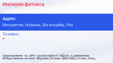 Империя фитнеса по адресу Ингушетия, Назрань, Богатырёва, 54а в дальнейшем Организация, размещена в следующих категориях: