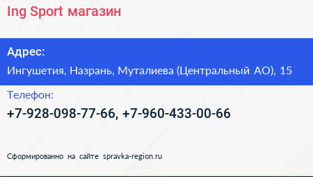 Ing Sport, магазин по адресу Ингушетия, Назрань, Муталиева (Центральный АО), 15 в дальнейшем Организация, размещена в следующих категориях: