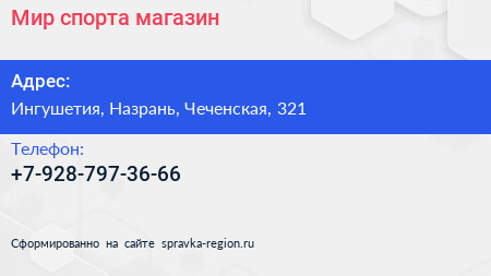 Мир спорта, магазин по адресу Ингушетия, Назрань, Чеченская, 321 в дальнейшем Организация, размещена в следующих категориях: