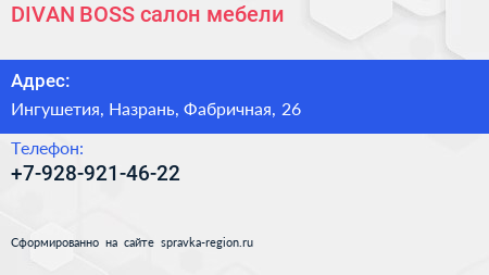 DIVAN BOSS, салон мебели по адресу Ингушетия, Назрань, Фабричная, 26 в дальнейшем Организация, размещена в следующих категориях: