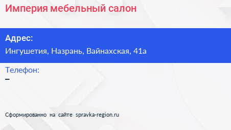 Империя, мебельный салон по адресу Ингушетия, Назрань, Вайнахская, 41а в дальнейшем Организация, размещена в следующих категориях: