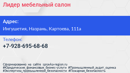Лидер, мебельный салон по адресу Ингушетия, Назрань, Картоева, 111а в дальнейшем Организация, размещена в следующих категориях: