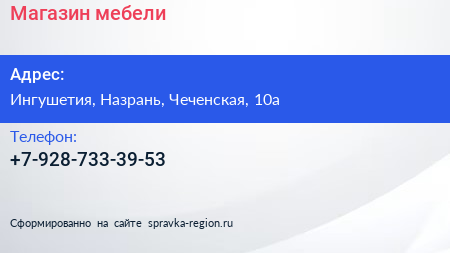 Магазин мебели по адресу Ингушетия, Назрань, Чеченская, 10а в дальнейшем Организация, размещена в следующих категориях: