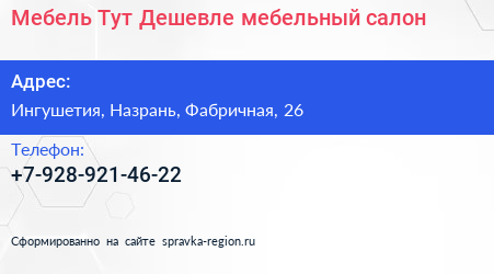 Мебель Тут Дешевле, мебельный салон по адресу Ингушетия, Назрань, Фабричная, 26 в дальнейшем Организация, размещена в следующих категориях: