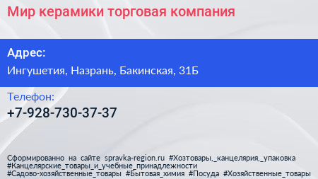 Мир керамики, торговая компания по адресу Ингушетия, Назрань, Бакинская, 31Б в дальнейшем Организация, размещена в следующих категориях: