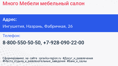 Много Мебели, мебельный салон по адресу Ингушетия, Назрань, Фабричная, 26 в дальнейшем Организация, размещена в следующих категориях: