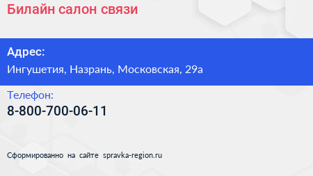 Билайн, салон связи по адресу Ингушетия, Назрань, Московская, 29а в дальнейшем Организация, размещена в следующих категориях: