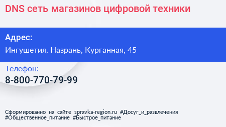 DNS, сеть магазинов цифровой техники по адресу Ингушетия, Назрань, Курганная, 45 в дальнейшем Организация, размещена в следующих категориях: