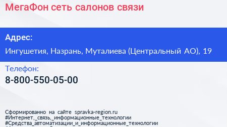 МегаФон, сеть салонов связи по адресу Ингушетия, Назрань, Муталиева (Центральный АО), 19 в дальнейшем Организация, размещена в следующих категориях: