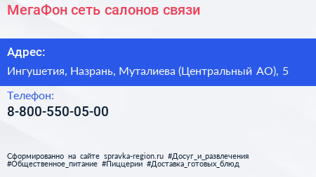 МегаФон, сеть салонов связи по адресу Ингушетия, Назрань, Муталиева (Центральный АО), 5 в дальнейшем Организация, размещена в следующих категориях: