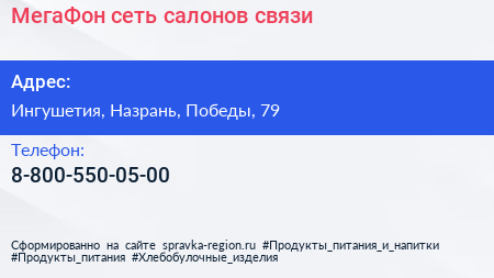 МегаФон, сеть салонов связи по адресу Ингушетия, Назрань, Победы, 79 в дальнейшем Организация, размещена в следующих категориях: