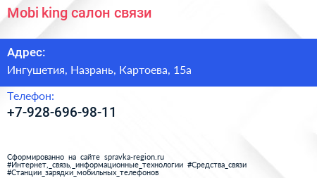 Mobi-king, салон связи по адресу Ингушетия, Назрань, Картоева, 15а в дальнейшем Организация, размещена в следующих категориях:
