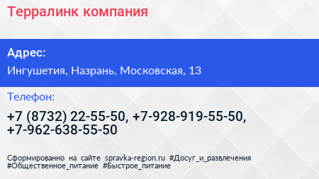 Терралинк, компания по адресу Ингушетия, Назрань, Московская, 13 в дальнейшем Организация, размещена в следующих категориях:
