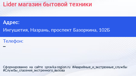 Lider, магазин бытовой техники по адресу Ингушетия, Назрань, проспект Базоркина, 102Б в дальнейшем Организация, размещена в следующих категориях: