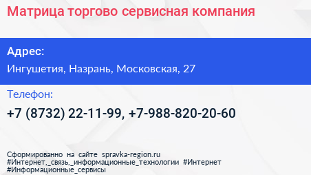Матрица, торгово-сервисная компания по адресу Ингушетия, Назрань, Московская, 27 в дальнейшем Организация, размещена в следующих категориях: