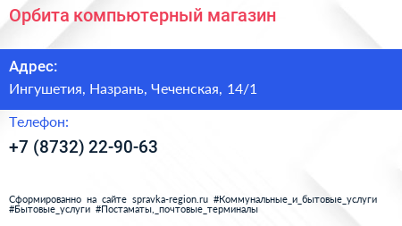 Орбита, компьютерный магазин по адресу Ингушетия, Назрань, Чеченская, 14/1 в дальнейшем Организация, размещена в следующих категориях: