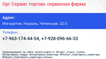 Орг-Сервис, торгово-сервисная фирма по адресу Ингушетия, Назрань, Чеченская, 22/1 в дальнейшем Организация, размещена в следующих категориях: