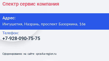 Спектр сервис, компания по адресу Ингушетия, Назрань, проспект Базоркина, 16в в дальнейшем Организация, размещена в следующих категориях: