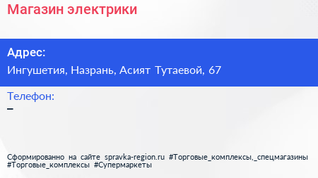 Магазин электрики по адресу Ингушетия, Назрань, Асият Тутаевой, 67 в дальнейшем Организация, размещена в следующих категориях: