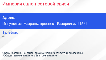 Империя, салон сотовой связи по адресу Ингушетия, Назрань, проспект Базоркина, 116/1 в дальнейшем Организация, размещена в следующих категориях: