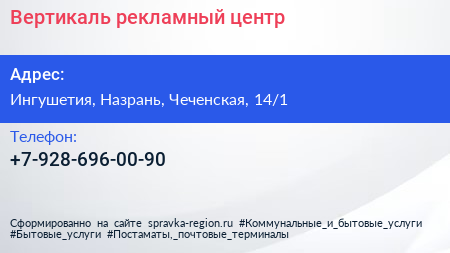 Вертикаль, рекламный центр по адресу Ингушетия, Назрань, Чеченская, 14/1 в дальнейшем Организация, размещена в следующих категориях: