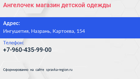 Ангелочек, магазин детской одежды по адресу Ингушетия, Назрань, Картоева, 154 в дальнейшем Организация, размещена в следующих категориях: