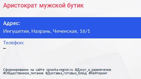 Аристократ, мужской бутик по адресу Ингушетия, Назрань, Чеченская, 16/1 в дальнейшем Организация, размещена в следующих категориях: