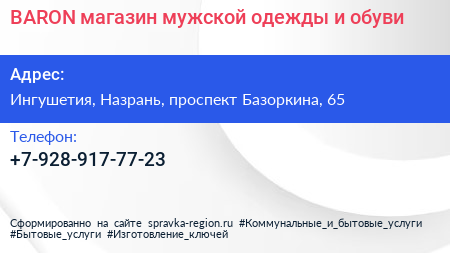 BARON, магазин мужской одежды и обуви по адресу Ингушетия, Назрань, проспект Базоркина, 65 в дальнейшем Организация, размещена в следующих категориях: