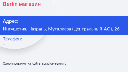 Berlin, магазин по адресу Ингушетия, Назрань, Муталиева (Центральный АО), 26 в дальнейшем Организация, размещена в следующих категориях: