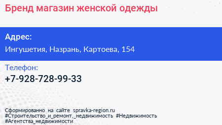 Бренд, магазин женской одежды по адресу Ингушетия, Назрань, Картоева, 154 в дальнейшем Организация, размещена в следующих категориях: