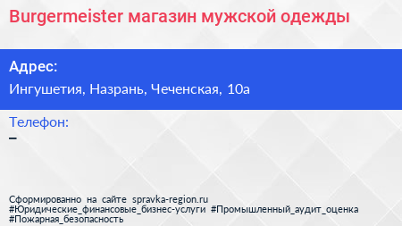 Burgermeister, магазин мужской одежды по адресу Ингушетия, Назрань, Чеченская, 10а в дальнейшем Организация, размещена в следующих категориях: