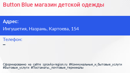 Button Blue, магазин детской одежды по адресу Ингушетия, Назрань, Картоева, 154 в дальнейшем Организация, размещена в следующих категориях: