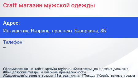 Craff, магазин мужской одежды по адресу Ингушетия, Назрань, проспект Базоркина, 8Б в дальнейшем Организация, размещена в следующих категориях: