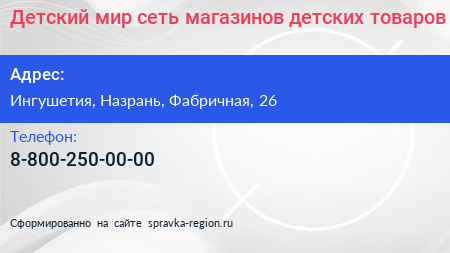 Детский мир, сеть магазинов детских товаров по адресу Ингушетия, Назрань, Фабричная, 26 в дальнейшем Организация, размещена в следующих категориях: