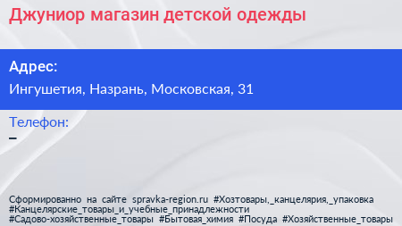 Джуниор, магазин детской одежды по адресу Ингушетия, Назрань, Московская, 31 в дальнейшем Организация, размещена в следующих категориях: