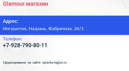 Glamour, магазин по адресу Ингушетия, Назрань, Фабричная, 26/1 в дальнейшем Организация, размещена в следующих категориях: