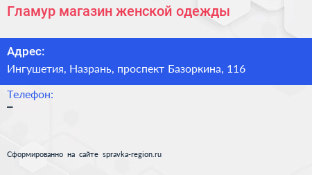 Гламур, магазин женской одежды по адресу Ингушетия, Назрань, проспект Базоркина, 116 в дальнейшем Организация, размещена в следующих категориях: