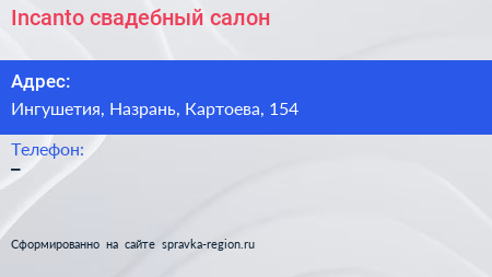 Incanto, cвадебный салон по адресу Ингушетия, Назрань, Картоева, 154 в дальнейшем Организация, размещена в следующих категориях:
