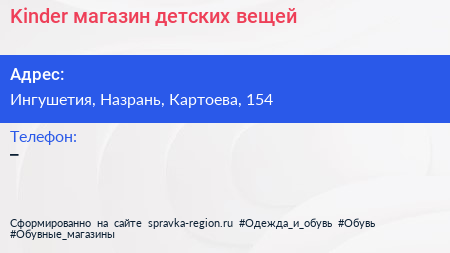 Kinder, магазин детских вещей по адресу Ингушетия, Назрань, Картоева, 154 в дальнейшем Организация, размещена в следующих категориях: