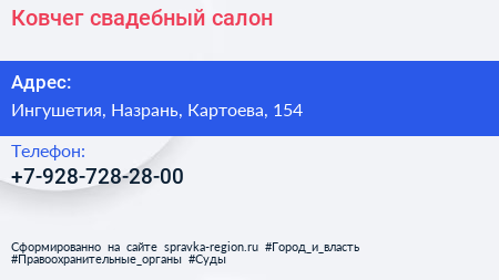 Ковчег, свадебный салон по адресу Ингушетия, Назрань, Картоева, 154 в дальнейшем Организация, размещена в следующих категориях: