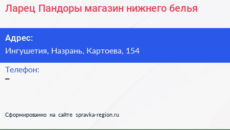 Ларец Пандоры, магазин нижнего белья по адресу Ингушетия, Назрань, Картоева, 154 в дальнейшем Организация, размещена в следующих категориях: